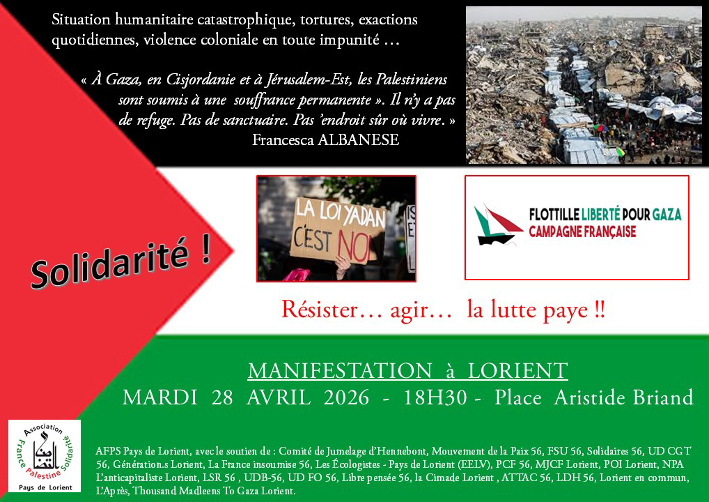 Prochaine manifestation à Lorient le 28 avril 18h30 place Aristide Briand